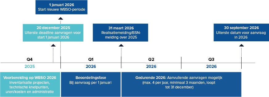 De voorbereiding voor WBSO 2026 start al in het vierde kwartaal van 2025. In deze periode inventariseert u welke projecten in aanmerking komen, brengt u technische knelpunten in kaart en maakt u een inschatting van de benodigde uren en kosten. Het is ook het moment om uw administratie voor te bereiden, zodat u vanaf 1 januari probleemloos kunt starten. Wilt u dat uw WBSO-verklaring direct op 1 januari ingaat? Dan moet de aanvraag uiterlijk 20 december 2025 bij RVO zijn ingediend.